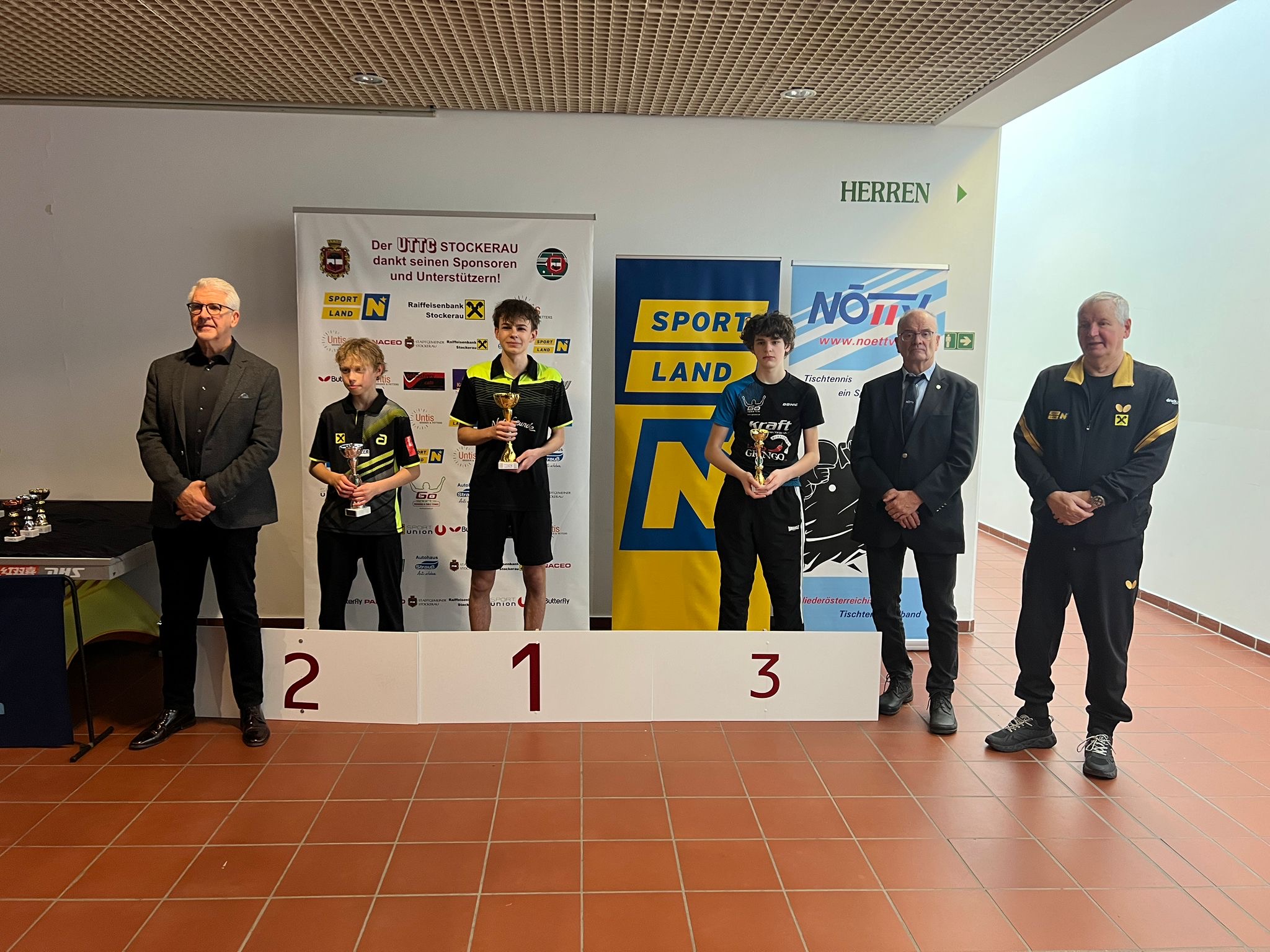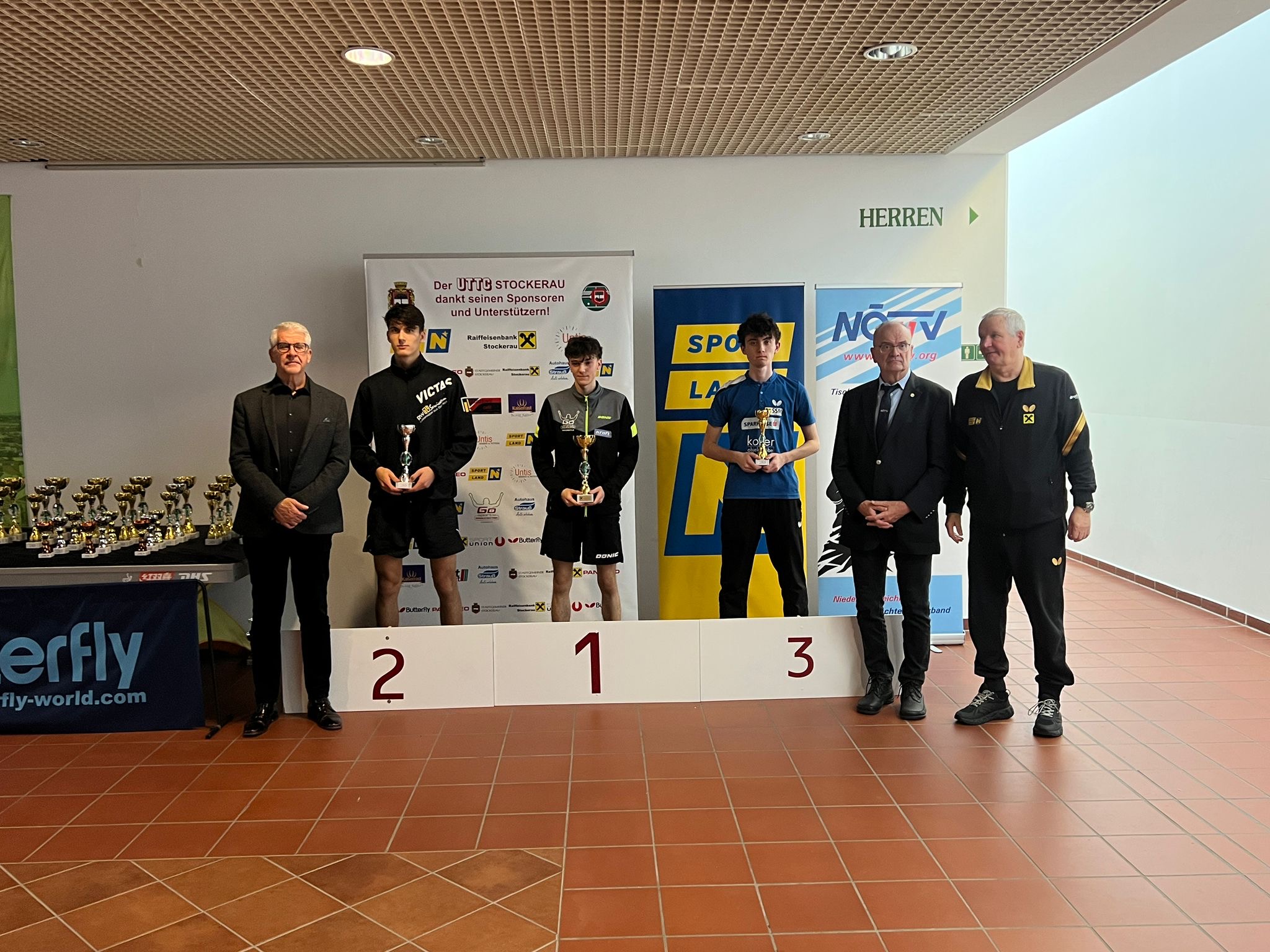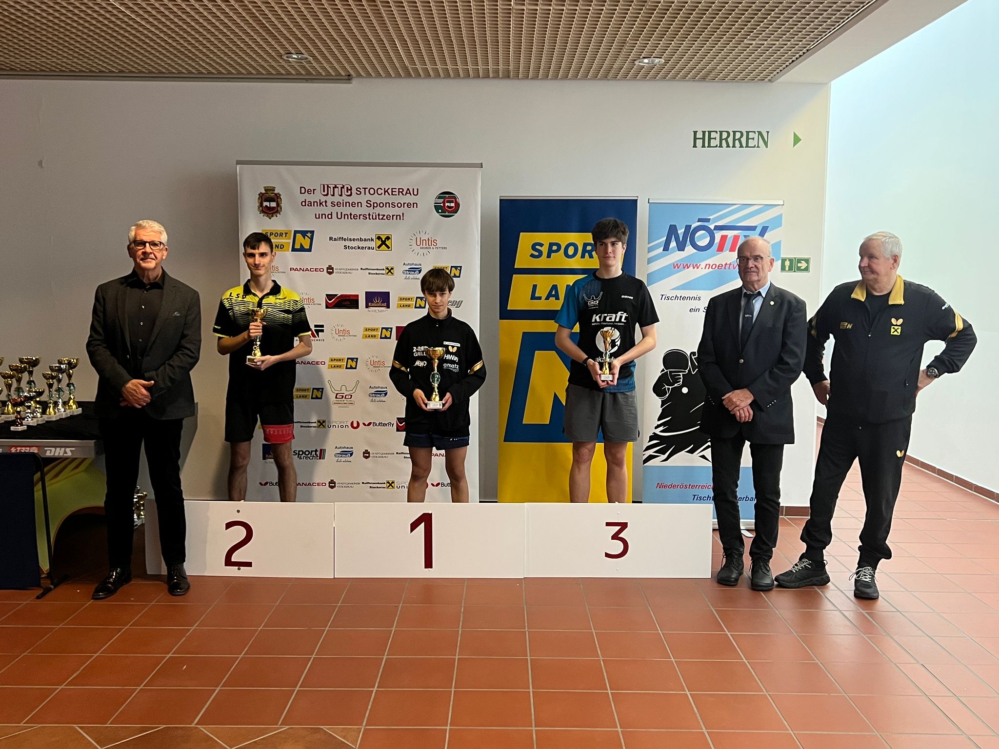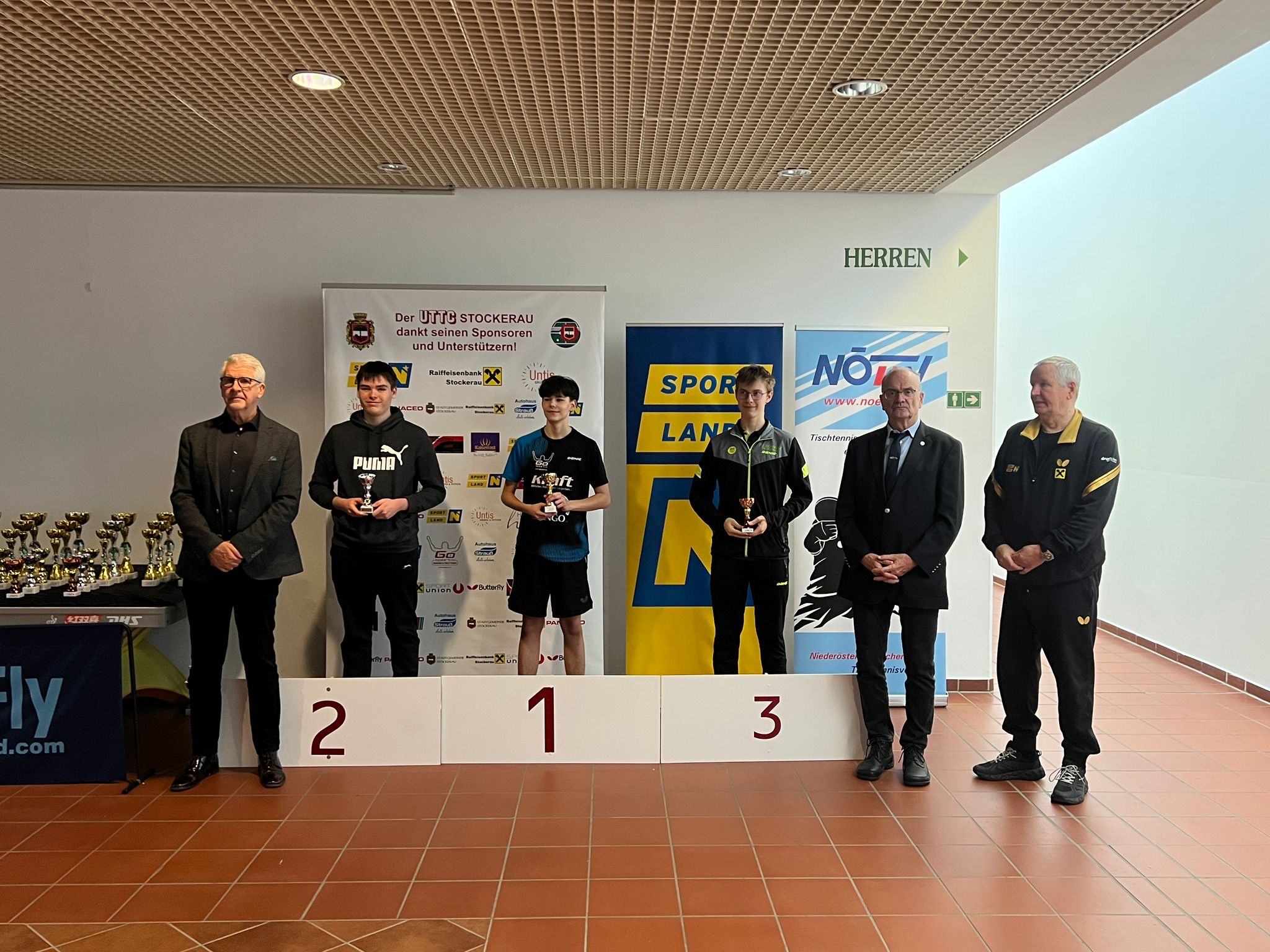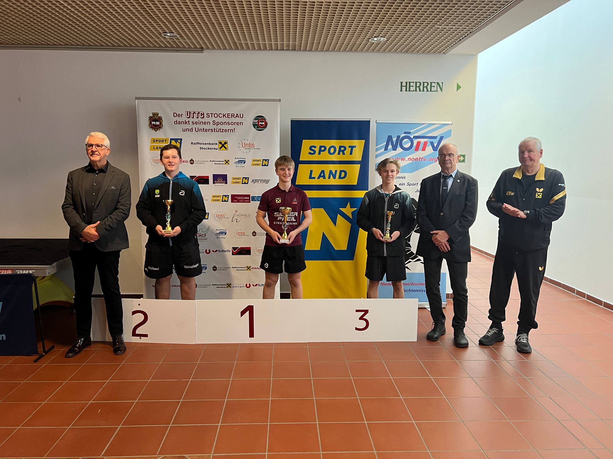 Die Siegerehrungen in Stockerau wurden von ATUS Obmann Markus Geineder moderiert. Alle Pokale wurden von der Raiffeisenbank Langenzersdorf und Stockerau dankenswerterweise gesponsert. Die Überreichung der Ehrenpreise übernahm der Präsident des ÖTTV Wolfgang Gotschke, der Präsident des Niederösterreichischen Landesverbandes Eduard Herzog sowie Hausherr und UTTC Stockerau Vorstand Stanislaw Fraczyk.