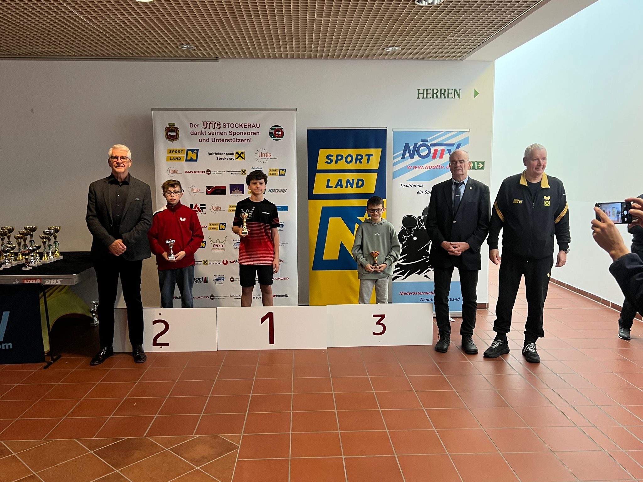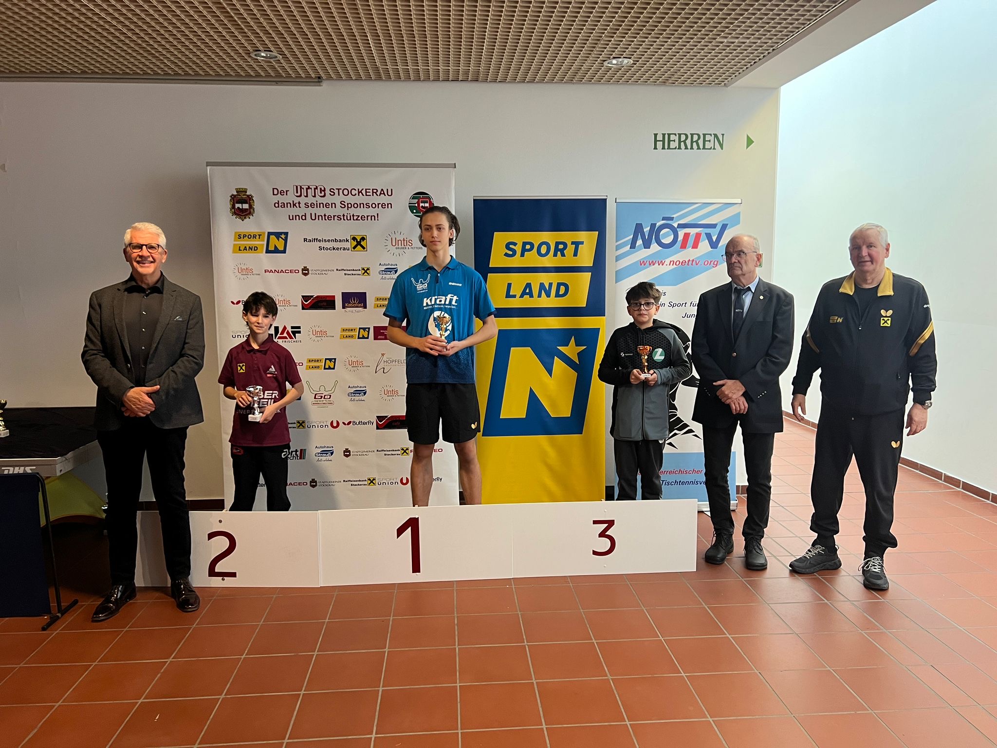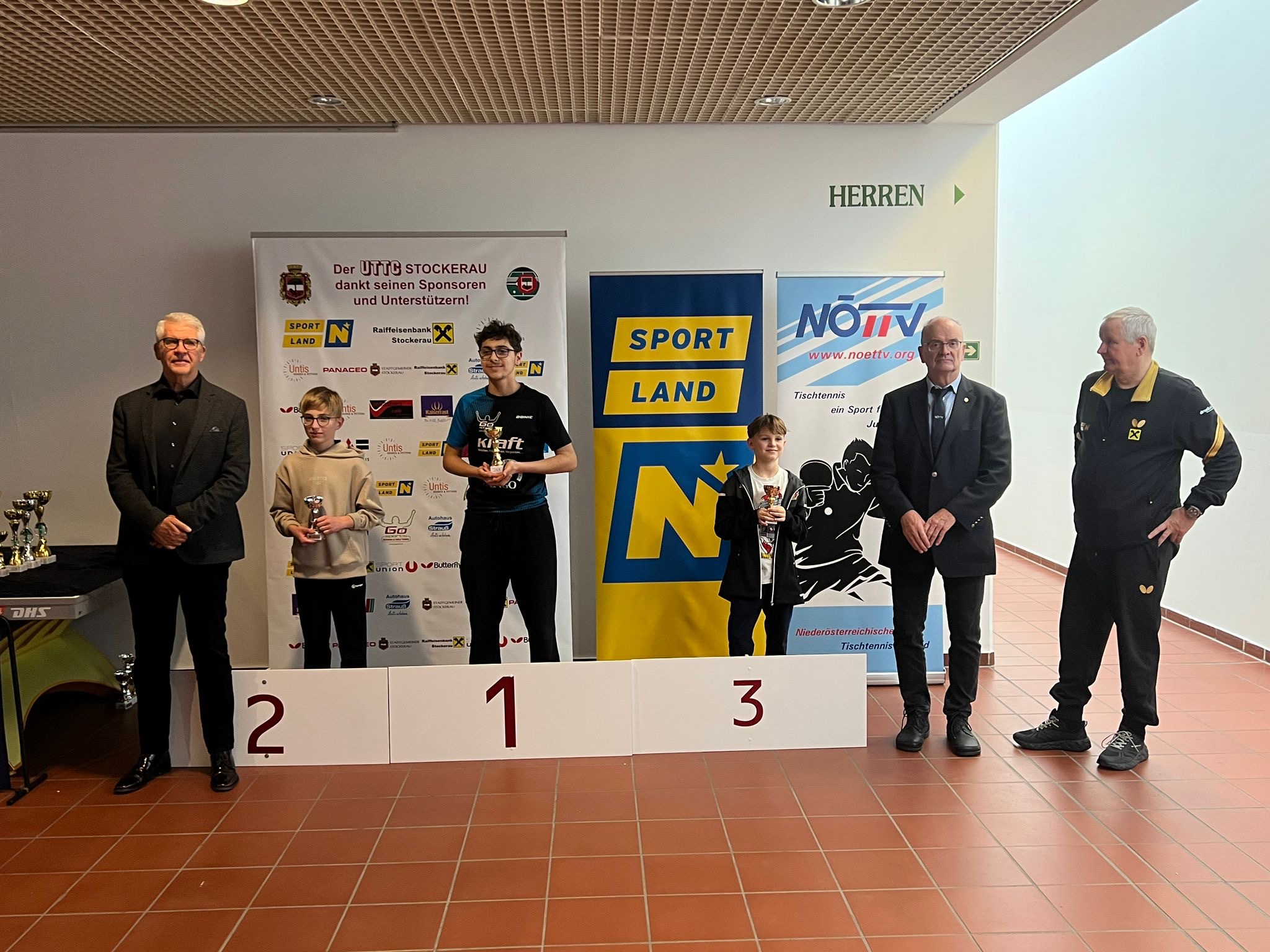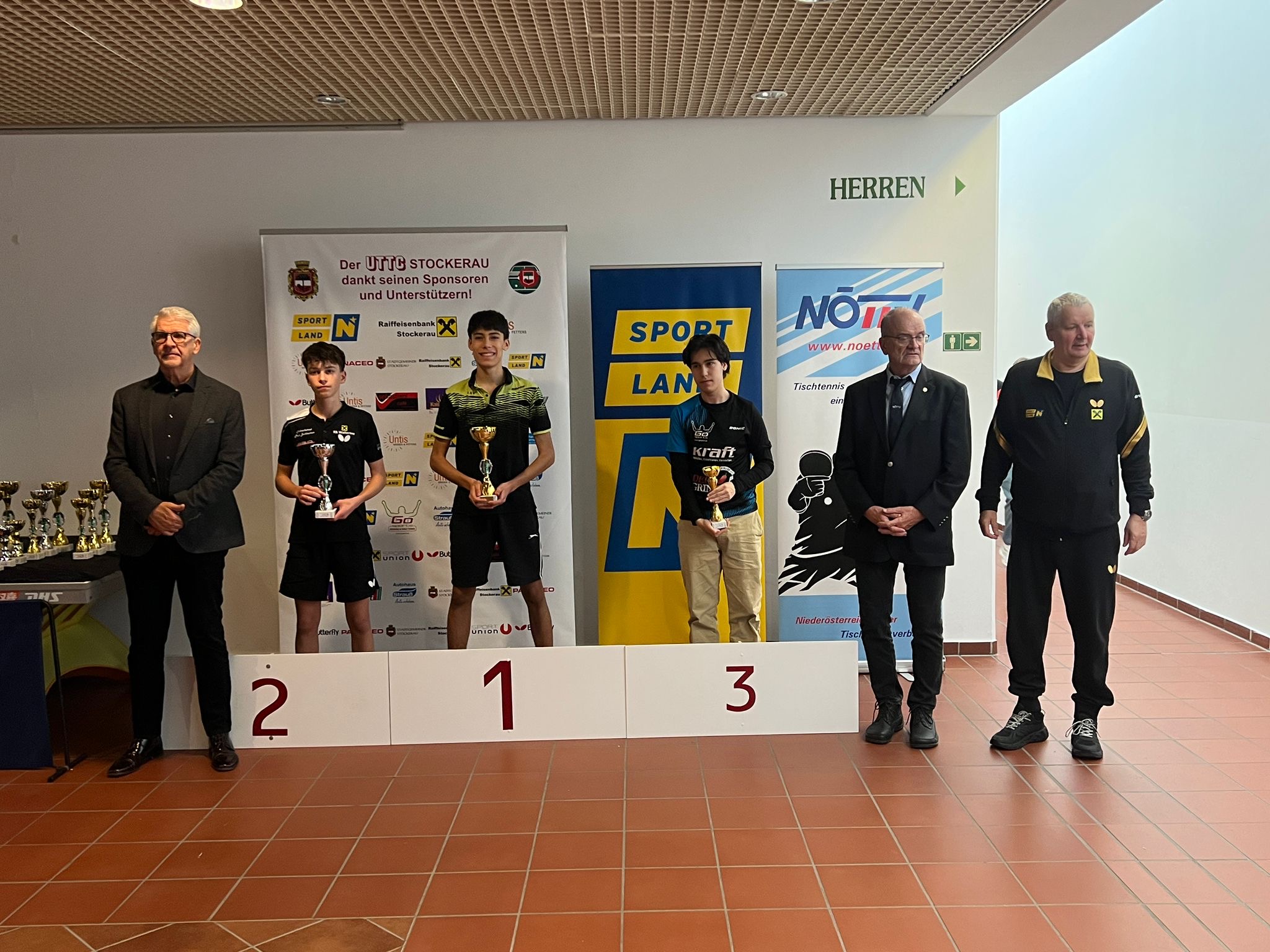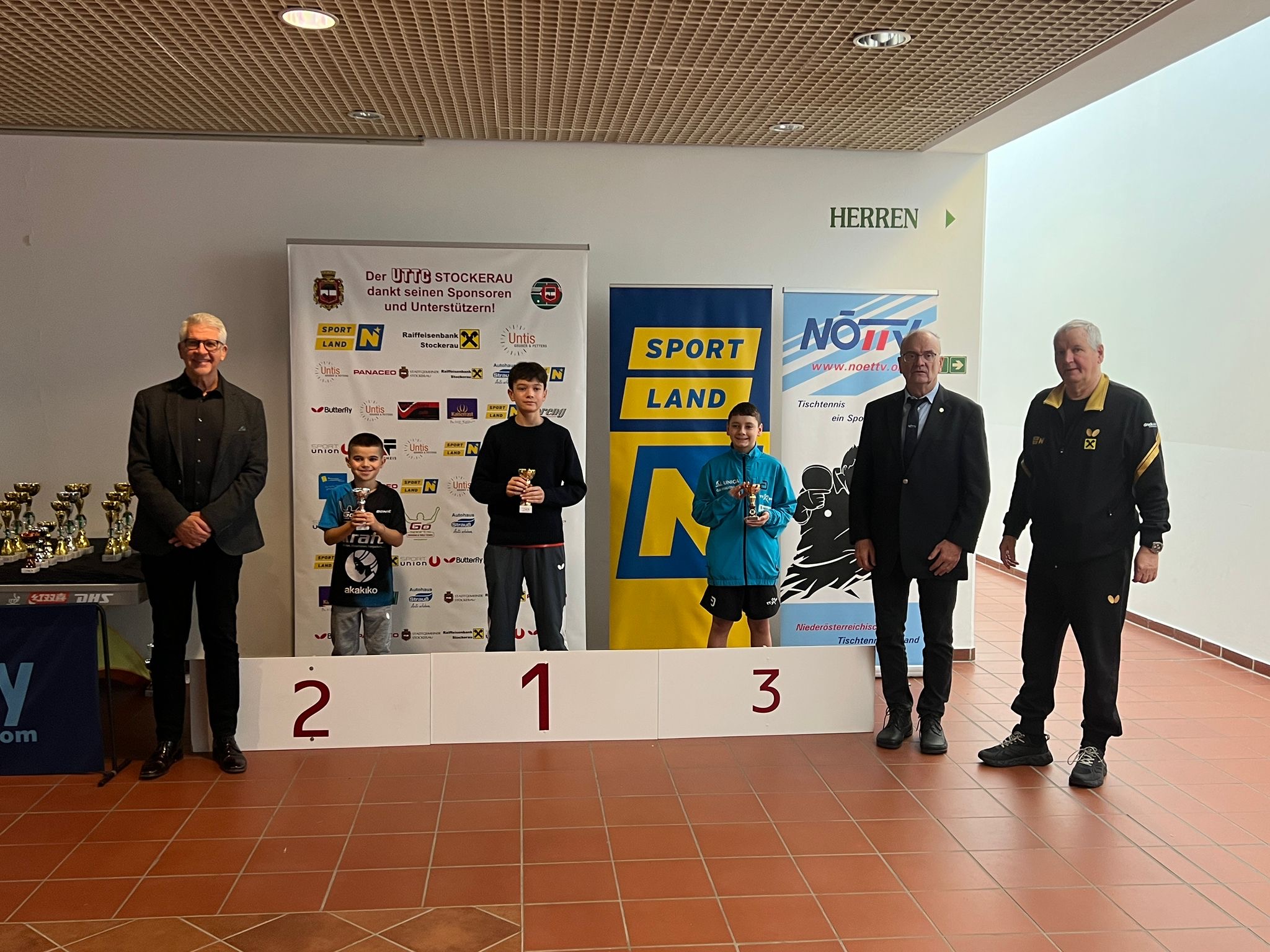 Die Siegerehrungen in Stockerau wurden von ATUS Obmann Markus Geineder moderiert. Alle Pokale wurden von der Raiffeisenbank Langenzersdorf und Stockerau dankenswerterweise gesponsert. Die Überreichung der Ehrenpreise übernahm der Präsident des ÖTTV Wolfgang Gotschke, der Präsident des Niederösterreichischen Landesverbandes Eduard Herzog sowie Hausherr und UTTC Stockerau Vorstand Stanislaw Fraczyk.